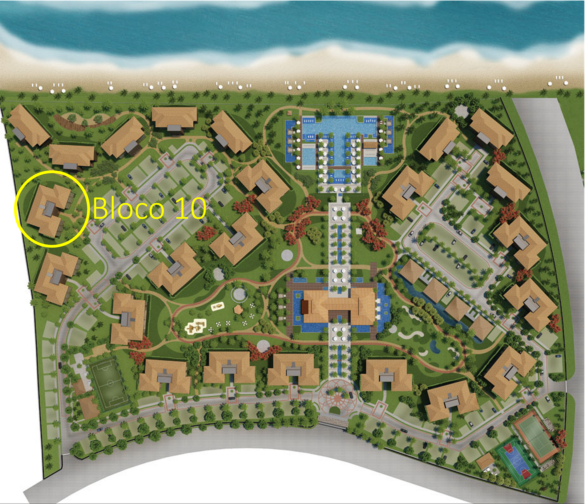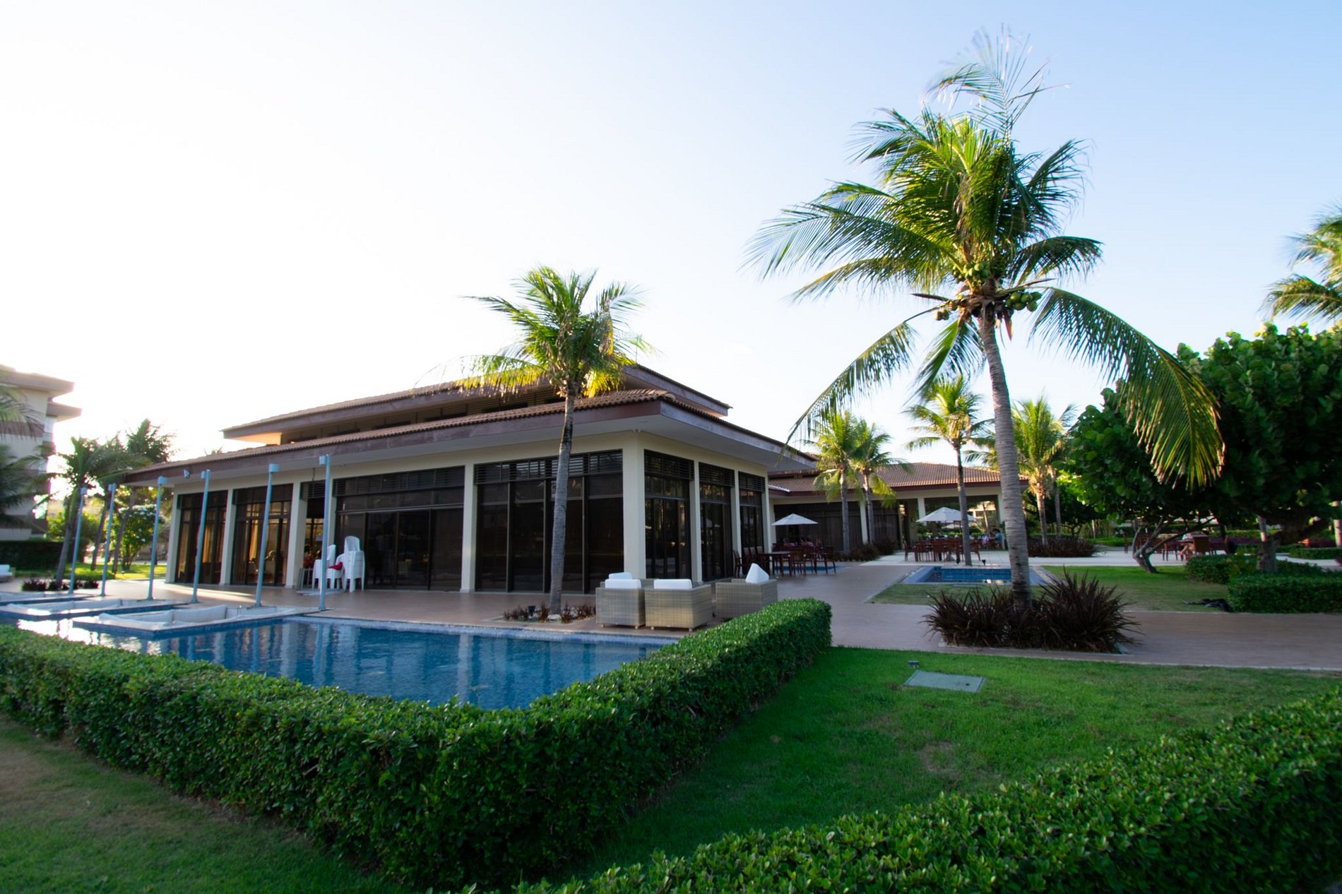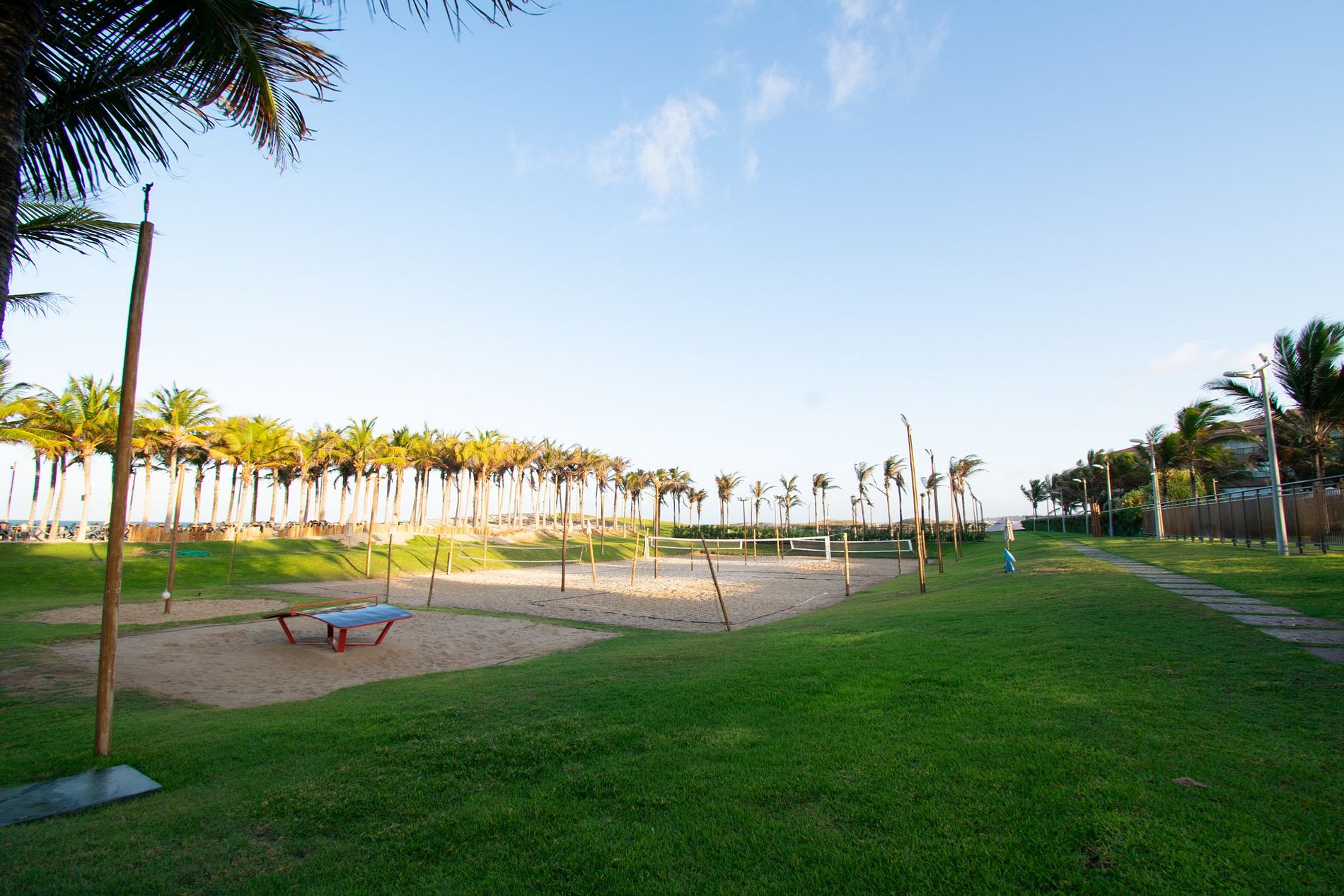 Piscina, quadras de beach tennis, restaurantes…