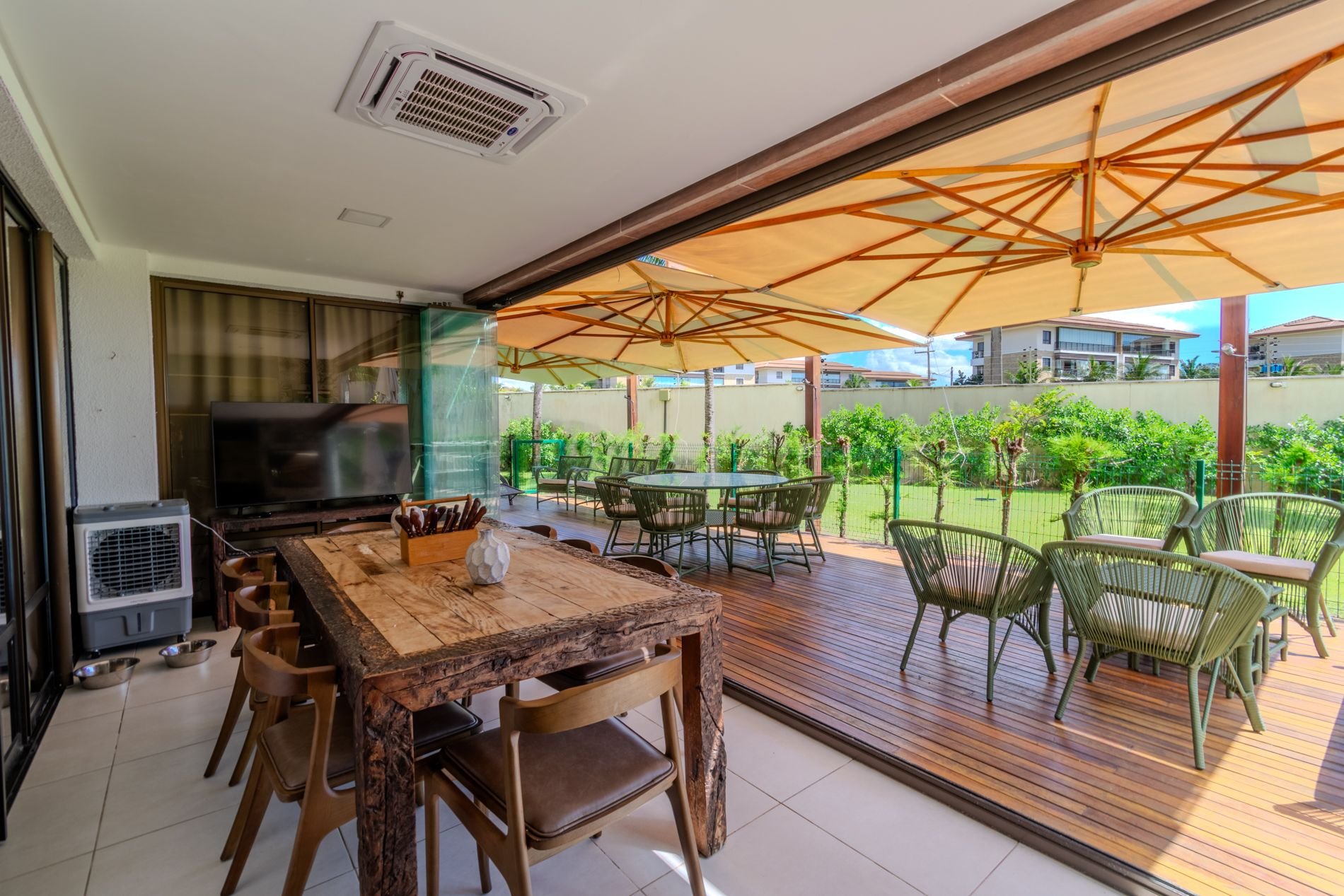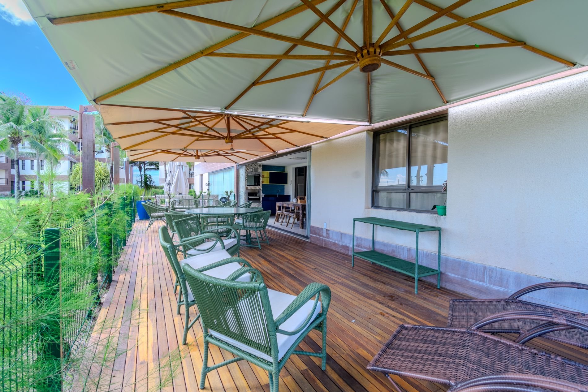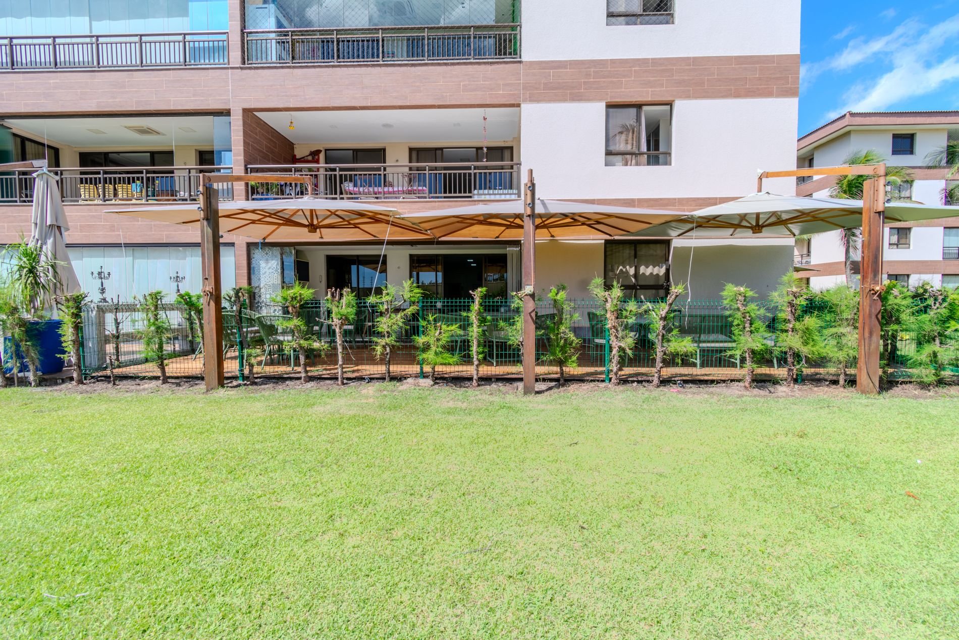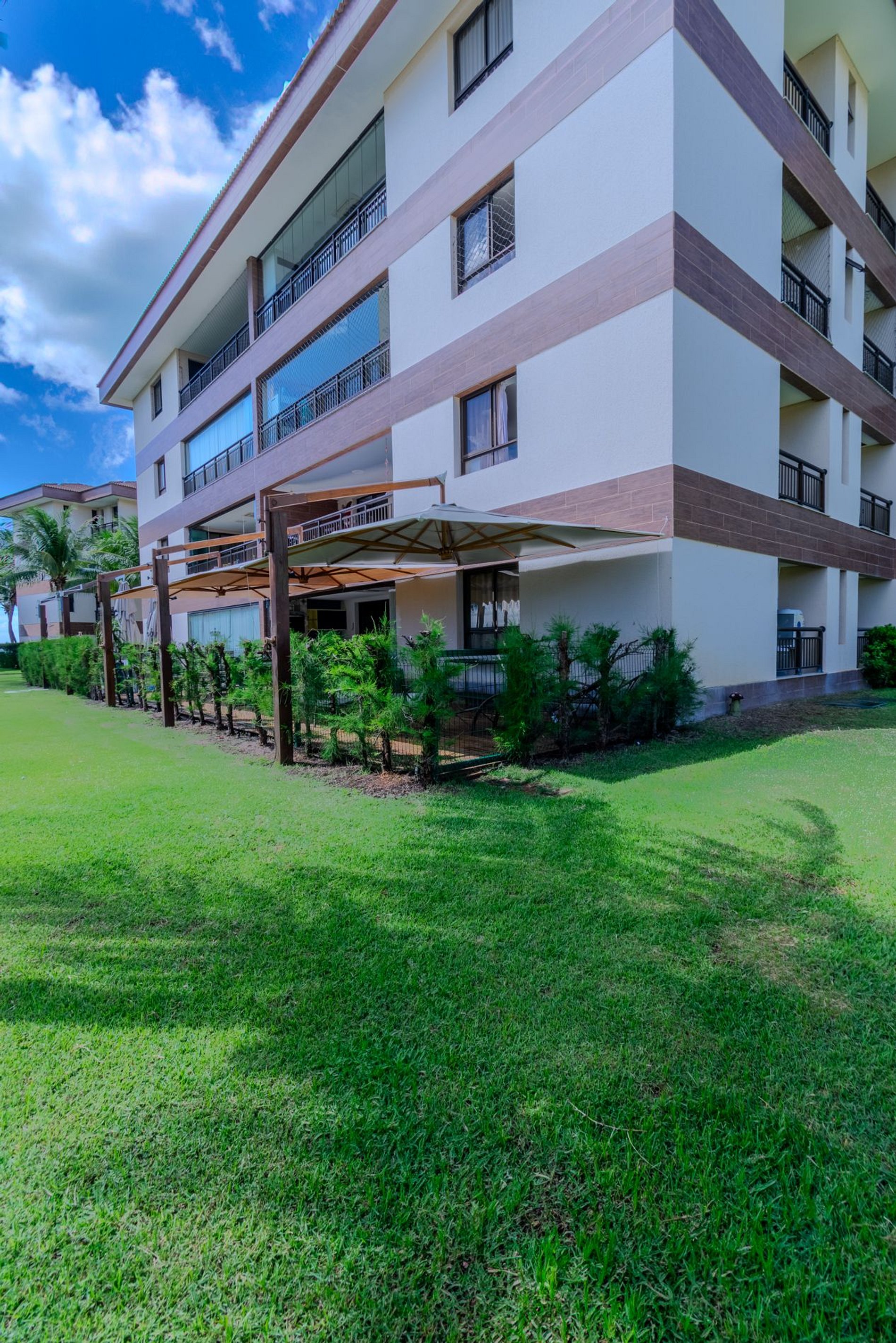 Apartamento com 118m2 Térreo no Condomínio Turístico Mandara Lanai. 4 quartos com Banheiros completos (03 suítes e 01 dependência), as 3 suítes possuem ar condicionado, cortinas com black-outs, sala de estar e de jantar climatizada e cervejeira, cozinha completa e equipada com lava-louças, área de serviço com máquina de lavar, varanda gourmet com churrasqueira e forno a gás, cortina de vidro, Jardim privativo (Maison) com piso de madeira e 03 Ombrelones e 02 vagas privativas cobertas. Apartamento muito bem decorado, com todos itens de conforto e praticidade. Desfrute uma estadia em família e amigos com total privacidade. Condômino amplo, pé na areia, acesso direto à praia e sem dúvidas espetacular para sua família. Piscina, quadras de beach tennis, restaurantes… Atração incrível do beach park fica a 4 km de distância. Melhor meio de transporte até o Condomínio é de veículo, aplicativos de transporte funcionam bem. Transporte público com parada de ônibus em frente a entrada do condomínio.