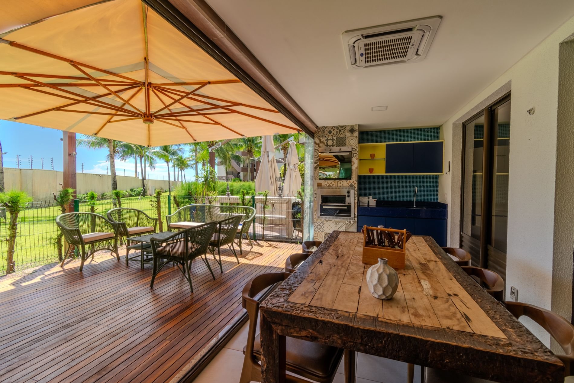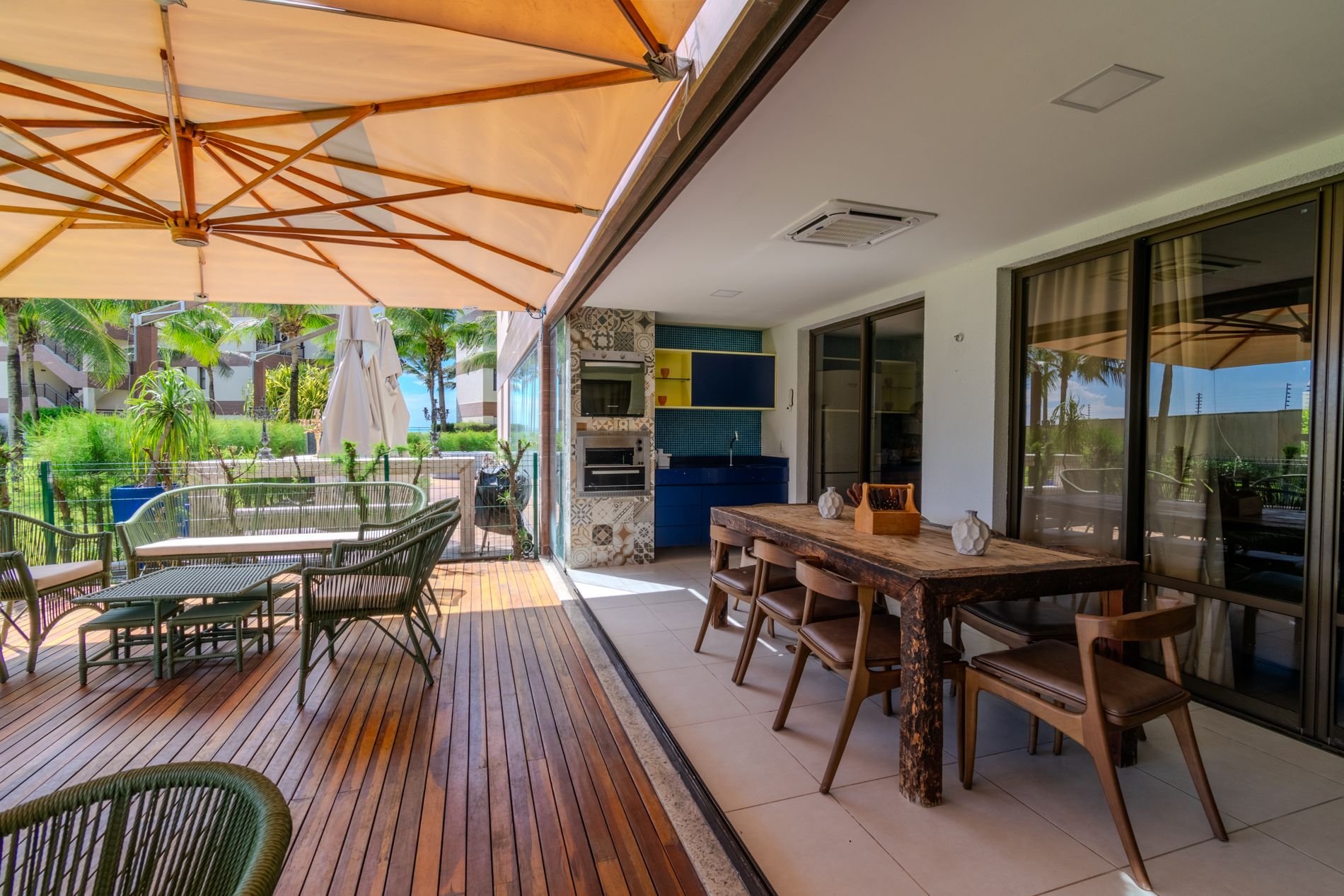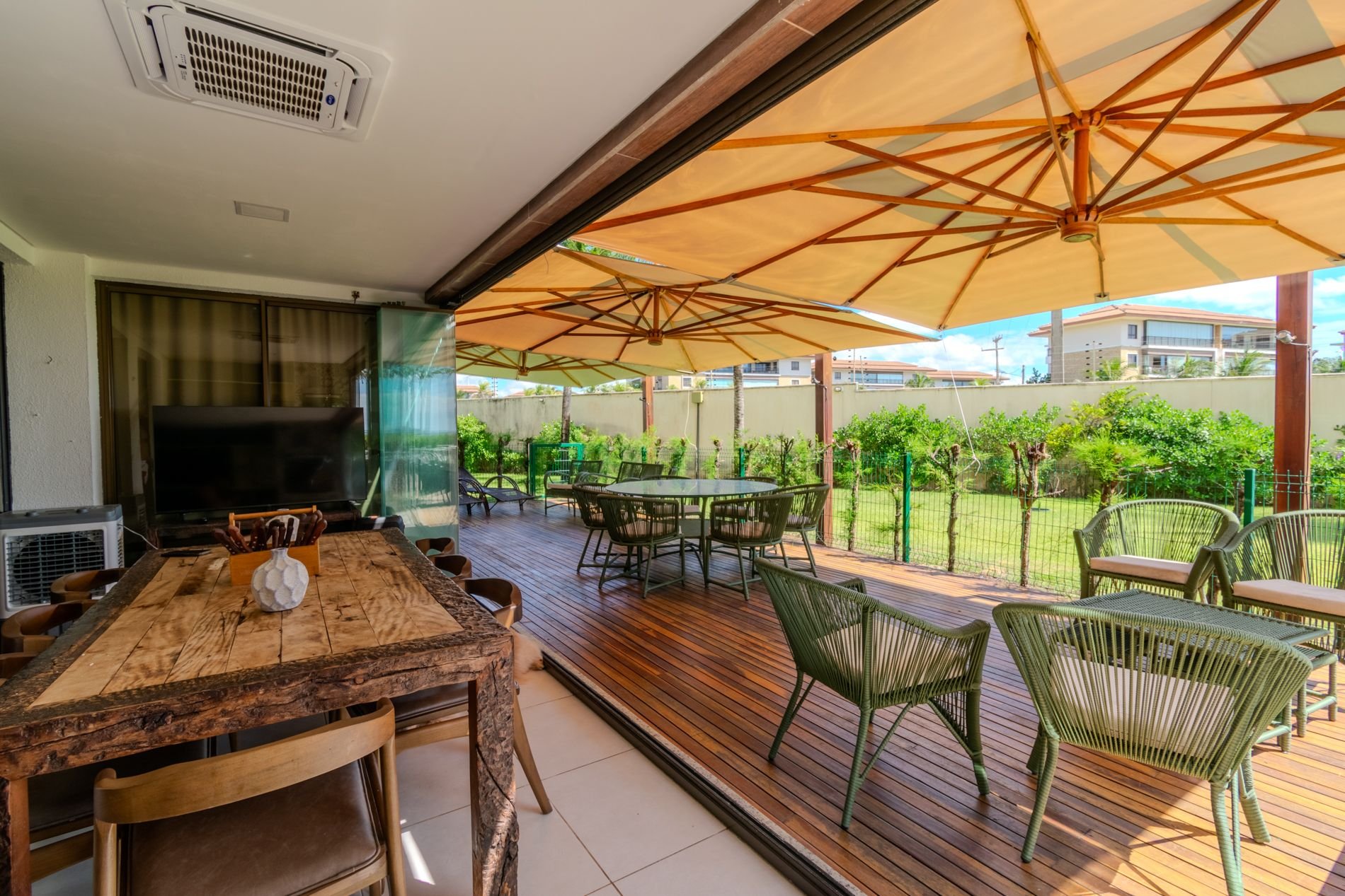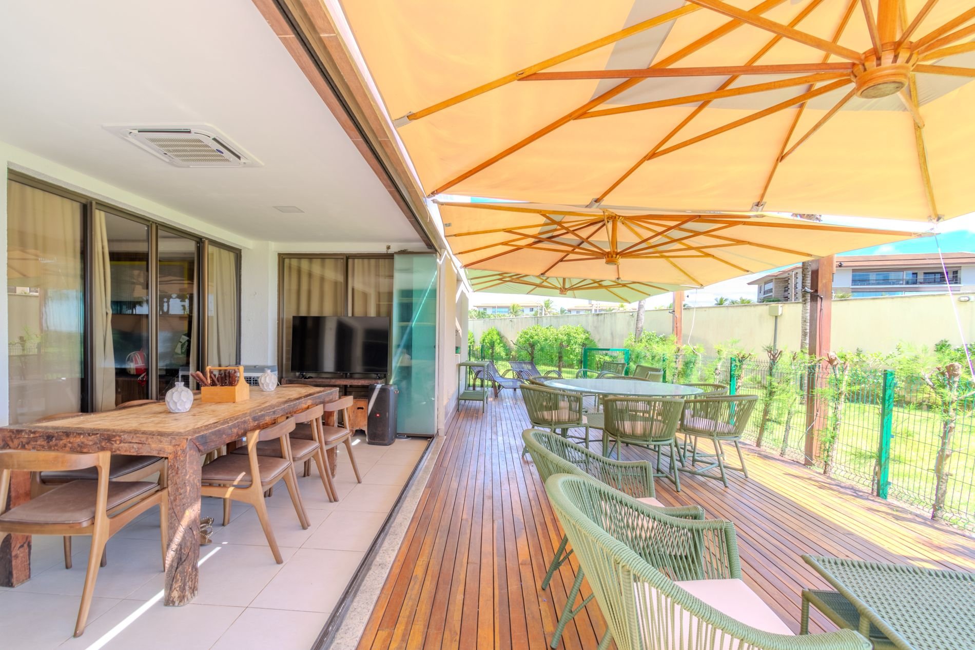 Apartamento com 118m2 Térreo no Condomínio Turístico Mandara Lanai. 4 quartos com Banheiros completos (03 suítes e 01 dependência), as 3 suítes possuem ar condicionado, cortinas com black-outs, sala de estar e de jantar climatizada e cervejeira, cozinha completa e equipada com lava-louças, área de serviço com máquina de lavar, varanda gourmet com churrasqueira e forno a gás, cortina de vidro, Jardim privativo (Maison) com piso de madeira e 03 Ombrelones e 02 vagas privativas cobertas. Apartamento muito bem decorado, com todos itens de conforto e praticidade. Desfrute uma estadia em família e amigos com total privacidade. Condômino amplo, pé na areia, acesso direto à praia e sem dúvidas espetacular para sua família. Piscina, quadras de beach tennis, restaurantes… Atração incrível do beach park fica a 4 km de distância. Melhor meio de transporte até o Condomínio é de veículo, aplicativos de transporte funcionam bem. Transporte público com parada de ônibus em frente a entrada do condomínio.