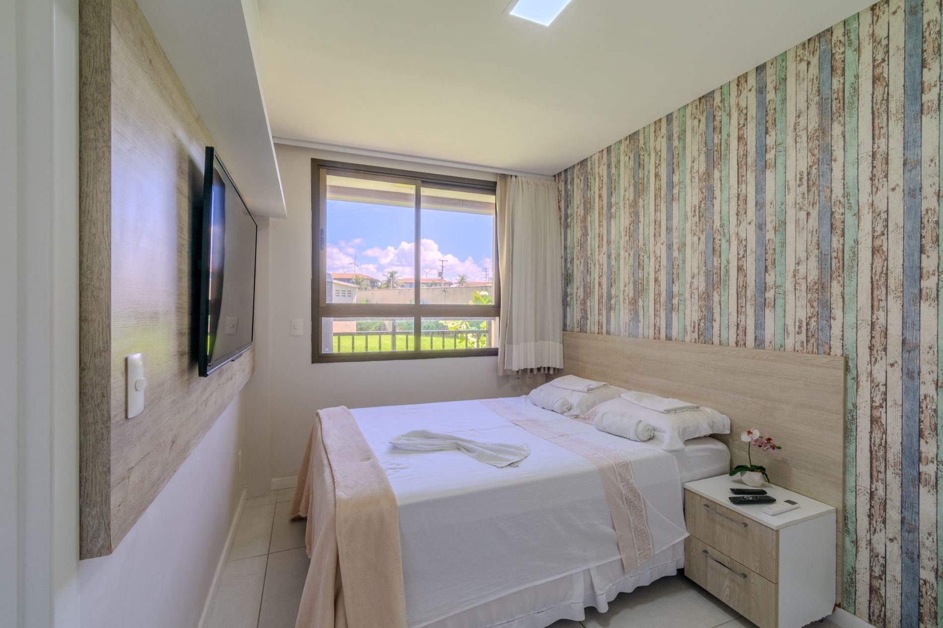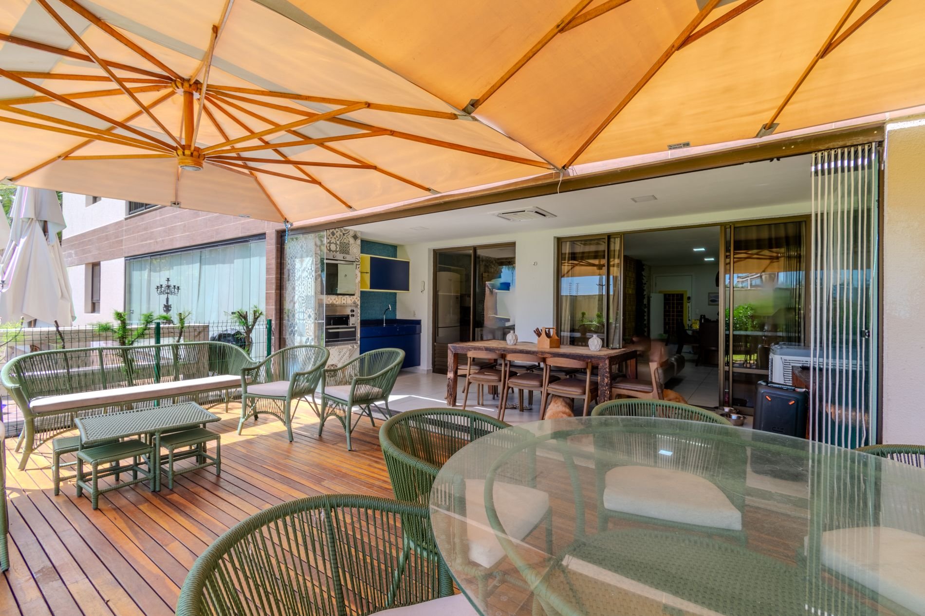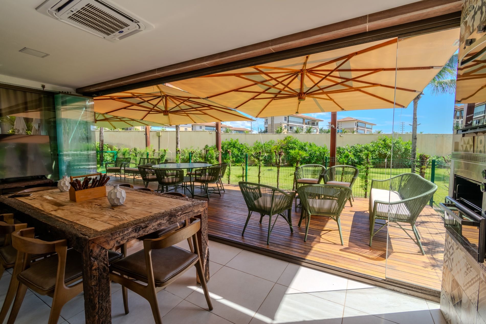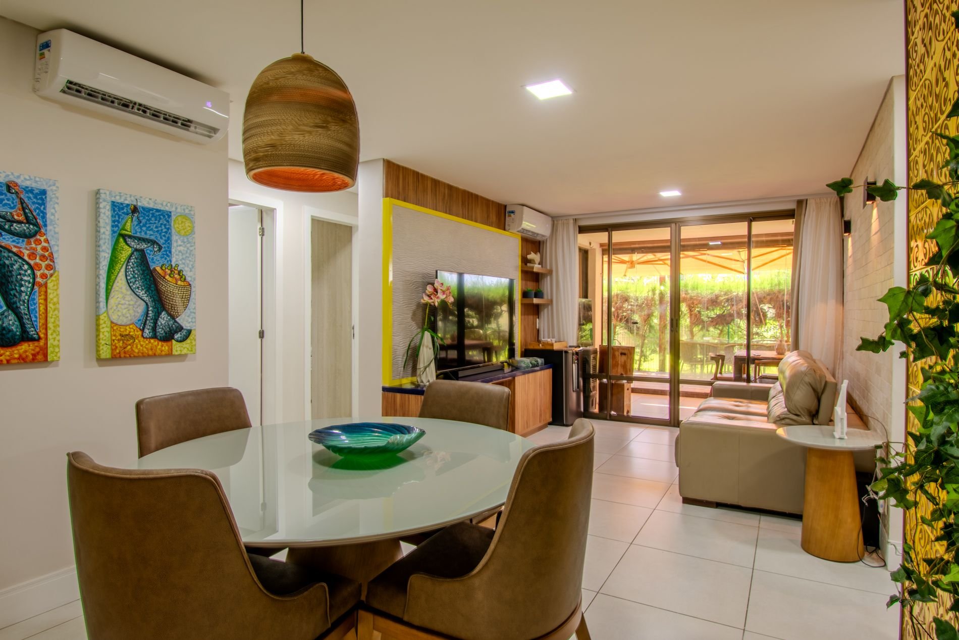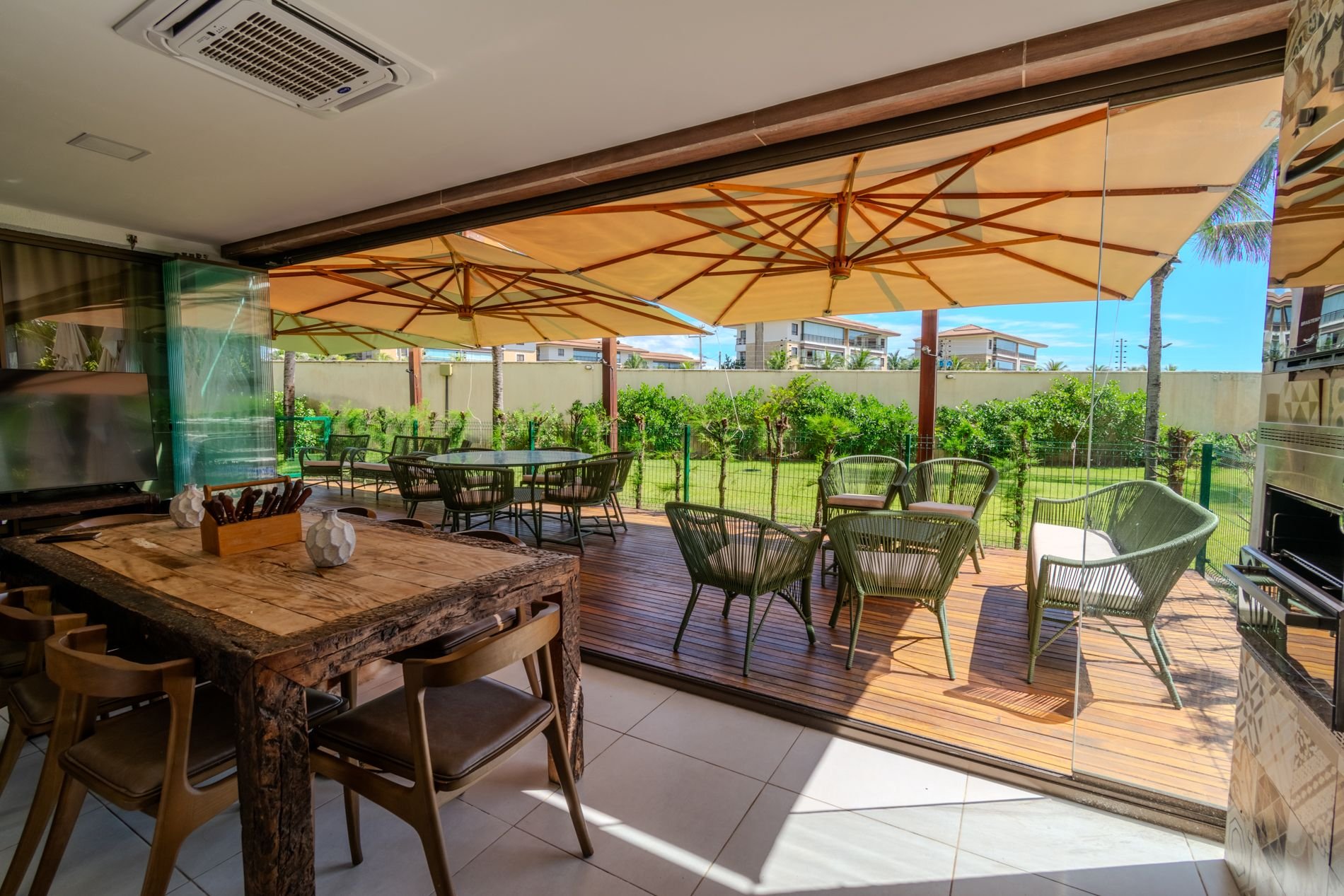 Apartamento com 118m2 Térreo no Condomínio Turístico Mandara Lanai. 4 quartos com Banheiros completos (03 suítes e 01 dependência), as 3 suítes possuem ar condicionado, cortinas com black-outs, sala de estar e de jantar climatizada e cervejeira, cozinha completa e equipada com lava-louças, área de serviço com máquina de lavar, varanda gourmet com churrasqueira e forno a gás, cortina de vidro, Jardim privativo (Maison) com piso de madeira e 03 Ombrelones e 02 vagas privativas cobertas. Apartamento muito bem decorado, com todos itens de conforto e praticidade. Desfrute uma estadia em família e amigos com total privacidade. Condômino amplo, pé na areia, acesso direto à praia e sem dúvidas espetacular para sua família. Piscina, quadras de beach tennis, restaurantes… Atração incrível do beach park fica a 4 km de distância. Melhor meio de transporte até o Condomínio é de veículo, aplicativos de transporte funcionam bem. Transporte público com parada de ônibus em frente a entrada do condomínio.