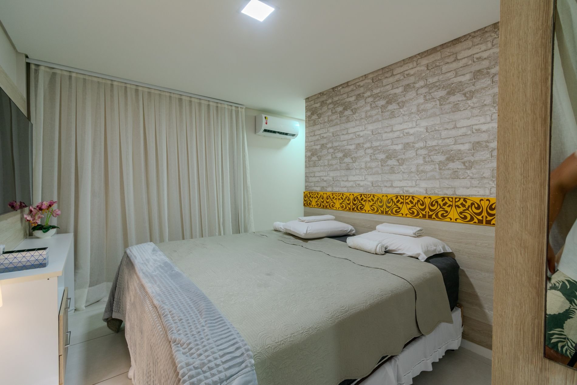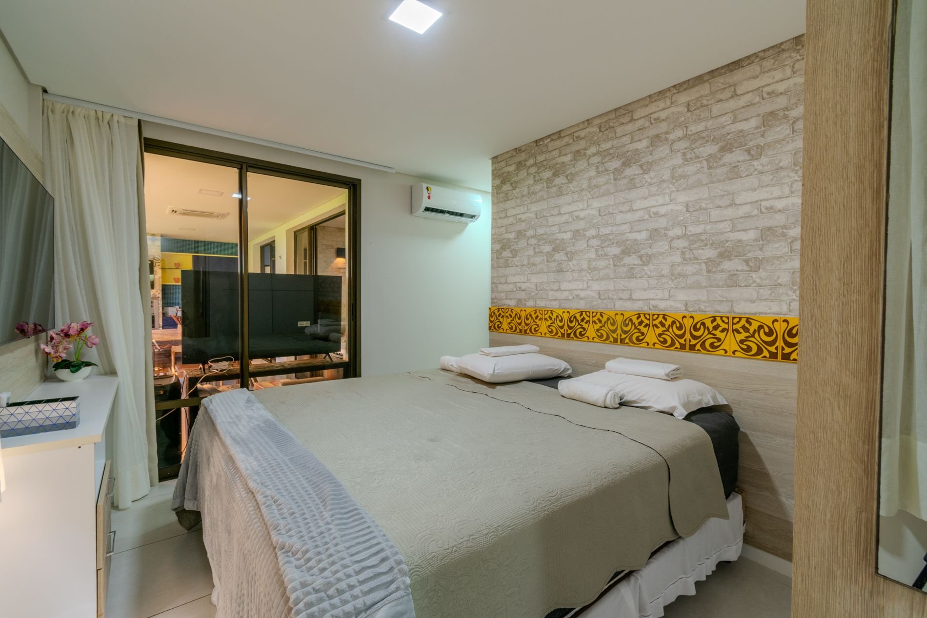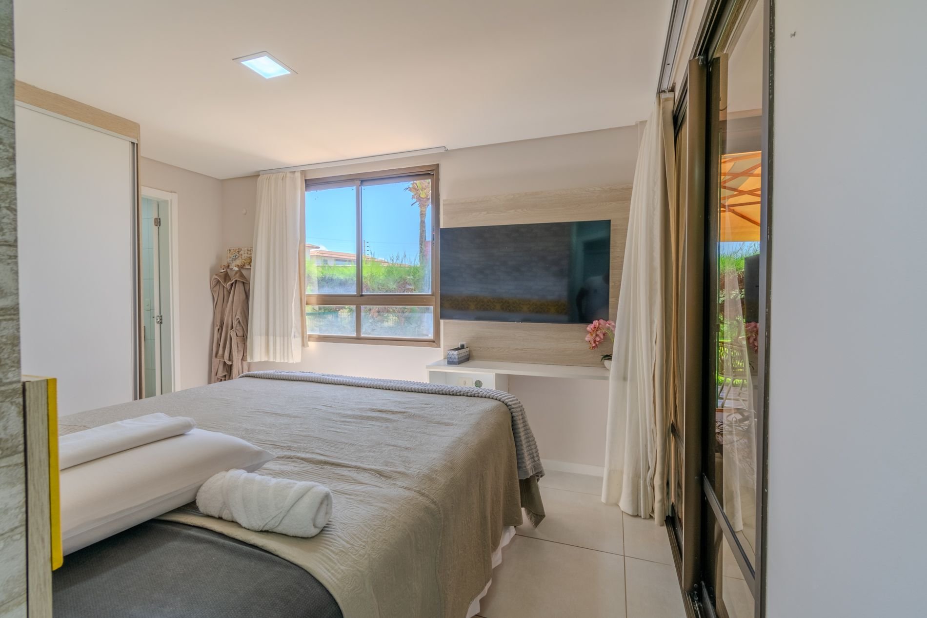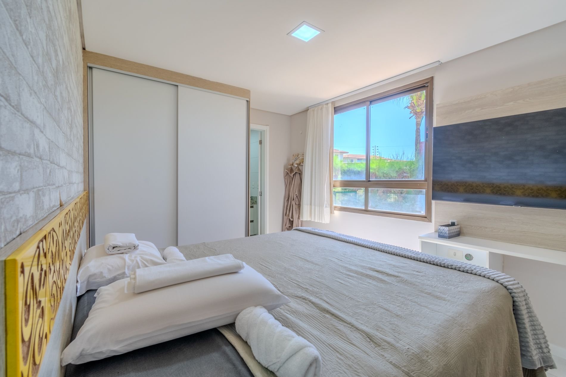 Apartamento com 118m2 Térreo no Condomínio Turístico Mandara Lanai. 4 quartos com Banheiros completos (03 suítes e 01 dependência), as 3 suítes possuem ar condicionado, cortinas com black-outs, sala de estar e de jantar climatizada e cervejeira, cozinha completa e equipada com lava-louças, área de serviço com máquina de lavar, varanda gourmet com churrasqueira e forno a gás, cortina de vidro, Jardim privativo (Maison) com piso de madeira e 03 Ombrelones e 02 vagas privativas cobertas. Apartamento muito bem decorado, com todos itens de conforto e praticidade. Desfrute uma estadia em família e amigos com total privacidade. Condômino amplo, pé na areia, acesso direto à praia e sem dúvidas espetacular para sua família. Piscina, quadras de beach tennis, restaurantes… Atração incrível do beach park fica a 4 km de distância. Melhor meio de transporte até o Condomínio é de veículo, aplicativos de transporte funcionam bem. Transporte público com parada de ônibus em frente a entrada do condomínio.