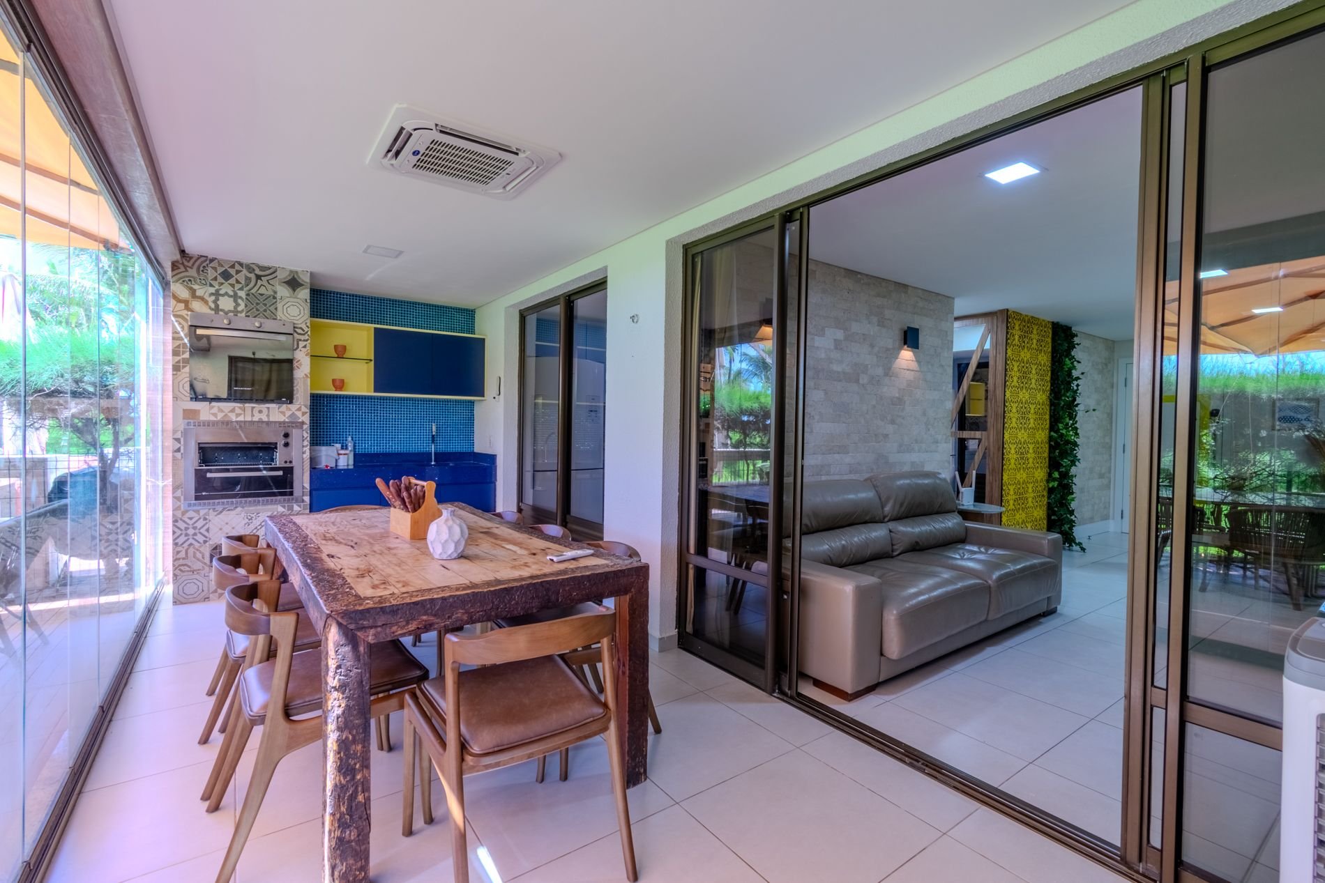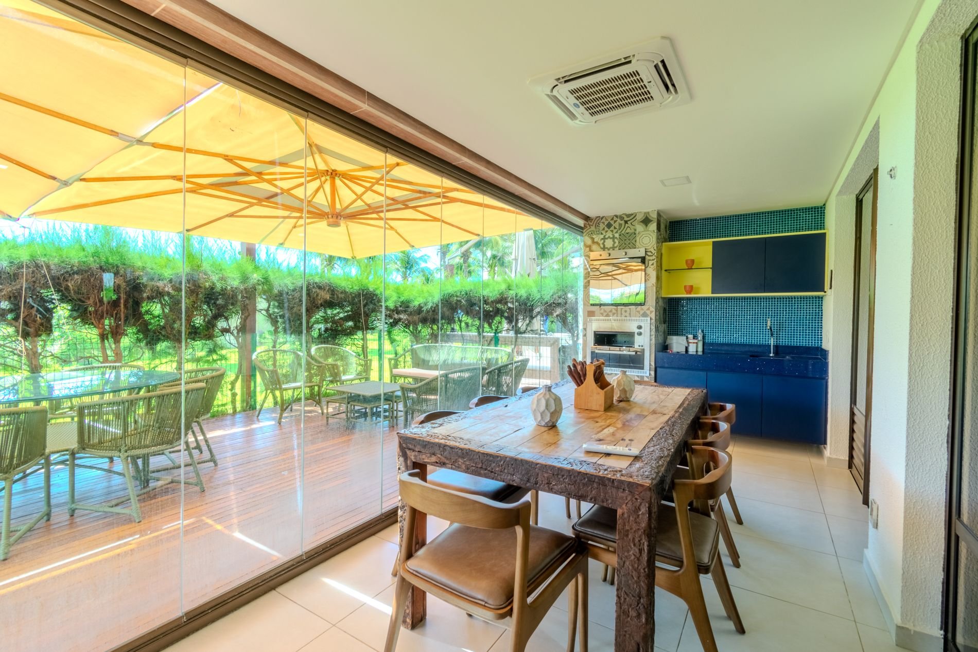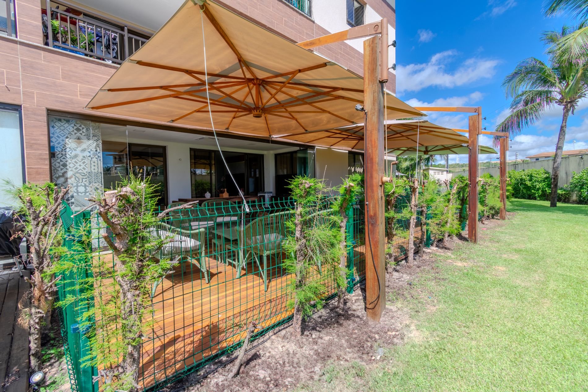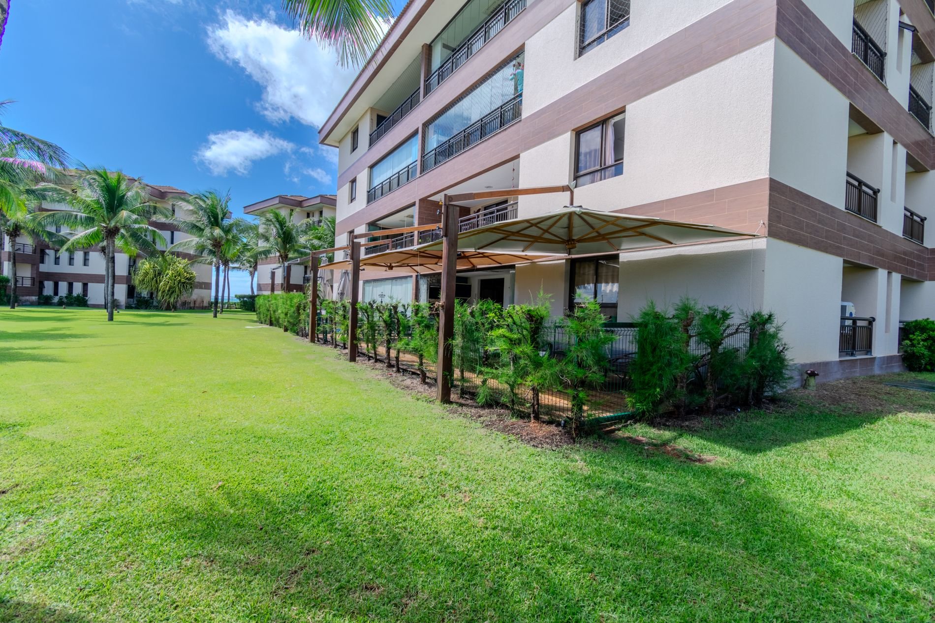 Apartamento com 118m2 Térreo no Condomínio Turístico Mandara Lanai. 4 quartos com Banheiros completos (03 suítes e 01 dependência), as 3 suítes possuem ar condicionado, cortinas com black-outs, sala de estar e de jantar climatizada e cervejeira, cozinha completa e equipada com lava-louças, área de serviço com máquina de lavar, varanda gourmet com churrasqueira e forno a gás, cortina de vidro, Jardim privativo (Maison) com piso de madeira e 03 Ombrelones e 02 vagas privativas cobertas.
